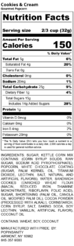 Ingredients: sugar, kettle corn mix contains: (corn syrup solids, raw sugar, sodium acid pyrophosphate), popcorn, white chocolate coating(sugar, palm kernel oil, titanium dioxide, lecithin, salt, natural and artificial flavors), water, sandwich cookies (enriched wheat flour(niacin, reduced iron, thiamine mononitrate, riboflavin, folic acid),sugar, shortening (palm oil, canola oil, modified palm oil), cocoa powder(processed with alkali), cornstarch, corn syrup, salt, baking soda, soy lecithin, vanillin, artificial flavor), coconut oil