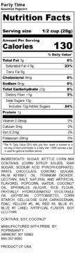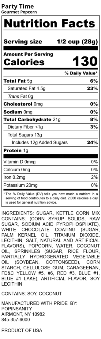 Ingredients: sugar, kettle corn mix contains: (corn syrup solids, raw sugar, sodium acid pyrophosphate), white chocolate coating (sugar, palm kernel oil, titanium dioxide, lecithin, salt, natural and artificial flavors), popcorn, water, coconut oil, sprinkles (sugar, rice flour, partially hydrogenated vegetable oil (soybean, cottonseed), corn starch, cellulose gum, carageenan, fd&c yellow #5, #6, red #3, blue #1, blue #1 lake), artificial flavor, soy lecithin