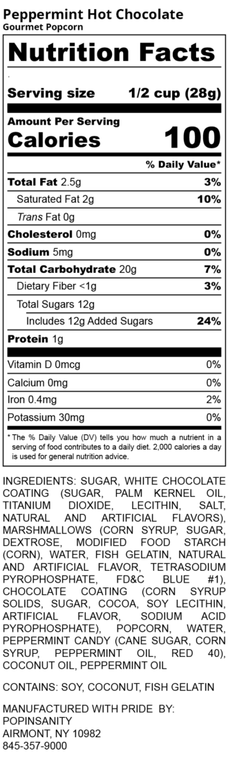 Ingredients: sugar, white chocolate coating (sugar, palm kernel oil, titanium dioxide, lecithin, salt, natural and artificial flavors), marshmallows (corn syrup, sugar, dextrose, modified food starch (corn), water, kosher fish gelatin, natural and artificial flavor, tetrasodium pyrophosphate, fd&c blue #1), chocolate coating (corn syrup solids, sugar, cocoa, soy lecithin, artificial flavor, sodium acid pyrophosphate), popcorn, water, peppermint candy (cane sugar, corn syrup, peppermint oil, red 40), coconut oil, peppermint oil
