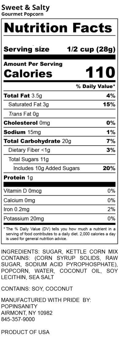 Ingredients: popinsanity caramel recipe (sugar, corn syrup solids, brown sugar, salt, caramel color, soy lecithin, natural flavor, <2% of calcium silicate, soybean oil to prevent caking), popcorn, water, coconut oil, seasoning (hydrogenated coconut oil, palm oil, hydrogenated cottonseed oil, beta carotene (color) (e160a), natural and artificial flavor), soy lecithin (soybean oil, soy lecithin), sea salt