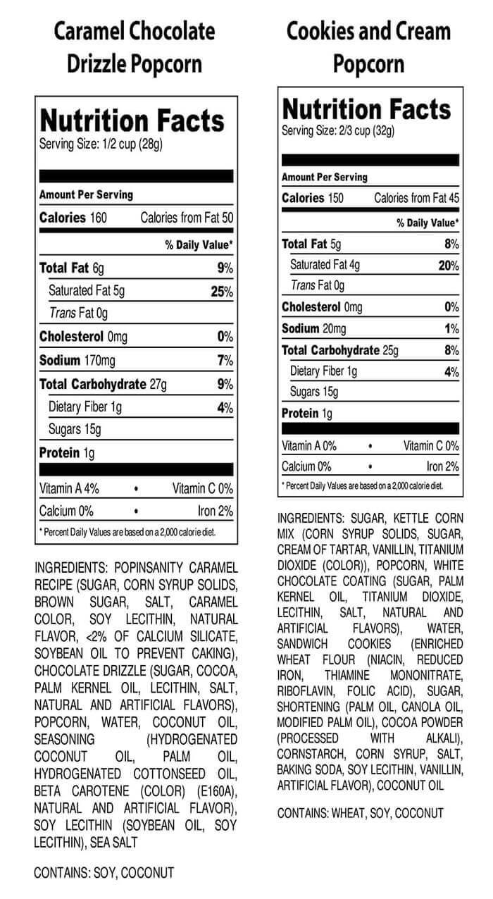 Each Popinsanity® product is clearly marked with a Nutritional Facts Panel which includes suggested serving size and servings per container. The suggested serving size of all Popinsanity® popcorn products is one ounce (28 grams). This chart is merely a guide for those planning parties & estimating portion sizes for events.