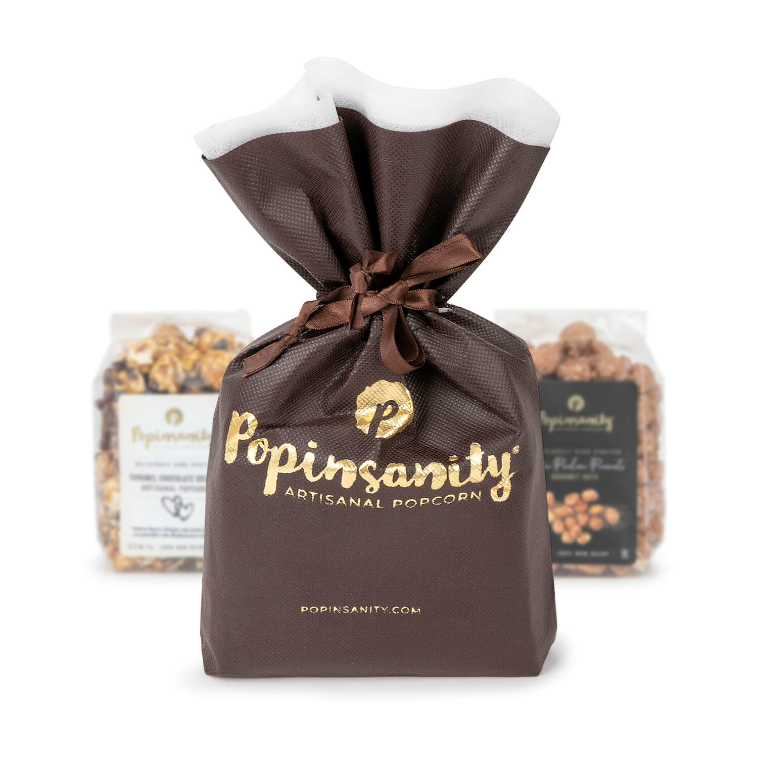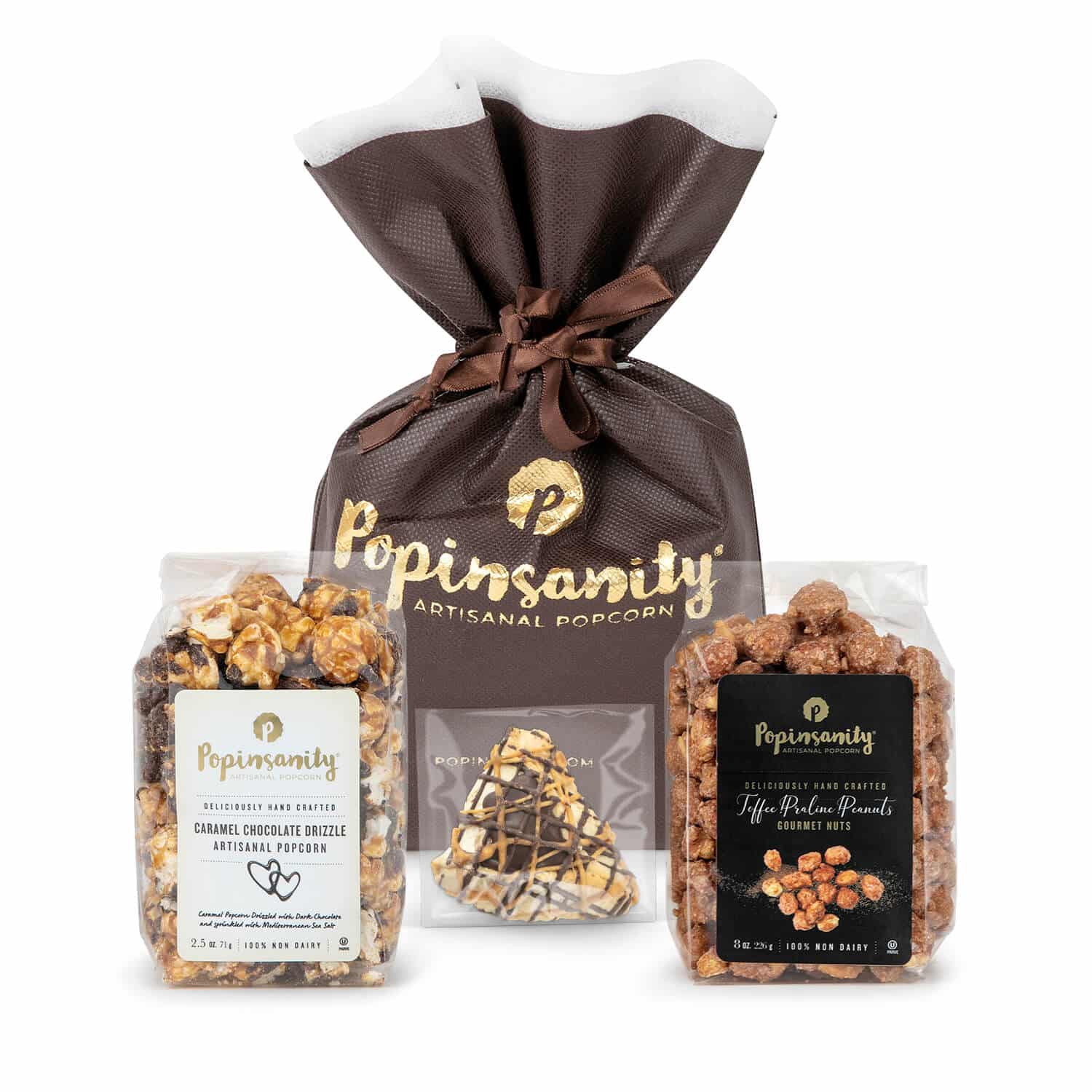 Surprise your loved ones, friends, and family with an elegant and indulgent Mishloach Manos gift bag that’s sure to impress. Perfect for anyone who loves a decadent treat, our gift bag features a tantalizing trio of gourmet goodies, including a 2.5oz bag of our famous Caramel Chocolate Drizzle Gourmet Popcorn, a 6oz bag of handcrafted Cinammon Praline Peanuts, and a freshly baked Caramel Chocolate Drizzle Hamantash – all made in small batches with the finest ingredients and expert craftsmanship.